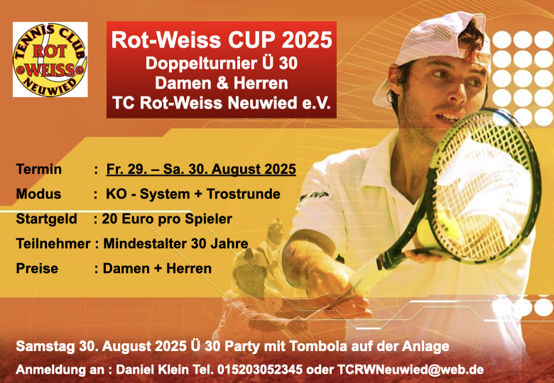 Der Tennisclub Rot-Weiss Neuwied veranstaltete auch in diesem Jahr wieder seinbeliebtes Doppelturnier auf der vereinseigenenAnlage in der Kraesner Straße, neben dem Fußballplatz Block. An zwei Tagen spielten Damendoppel und 10 Herrendoppel der Klasse Ü30 ihre Sieger aus. Das Damenfinale bestritten Claudia Selt und Julia Schmidt, TC Rengsdorf gegen Petra Kettler und Iris Näckel, TC Rot-Weiss Neuwied. Es siegtenSelt/Schmidt in 2 Sätzen. Bei den Herren gab es zwei Gruppensieger: Ingo Hoffmann und Jochen Schuth, beide TC Neuwied und Daniel Klein vom TC Rot-Weiss Neuwied mit Björn Henning vom TC Rhein-Wied. Bei deranschließenden Tombola gab es tolle Preise zu gewinnen und bei der traditionellen Ü30 Party konnte man leckere Cocktails genießen. Nach so einem gelungenen Turnier freut sich der TC bereits jetzt schon auf das Doppelturnier im nächsten Jahr.